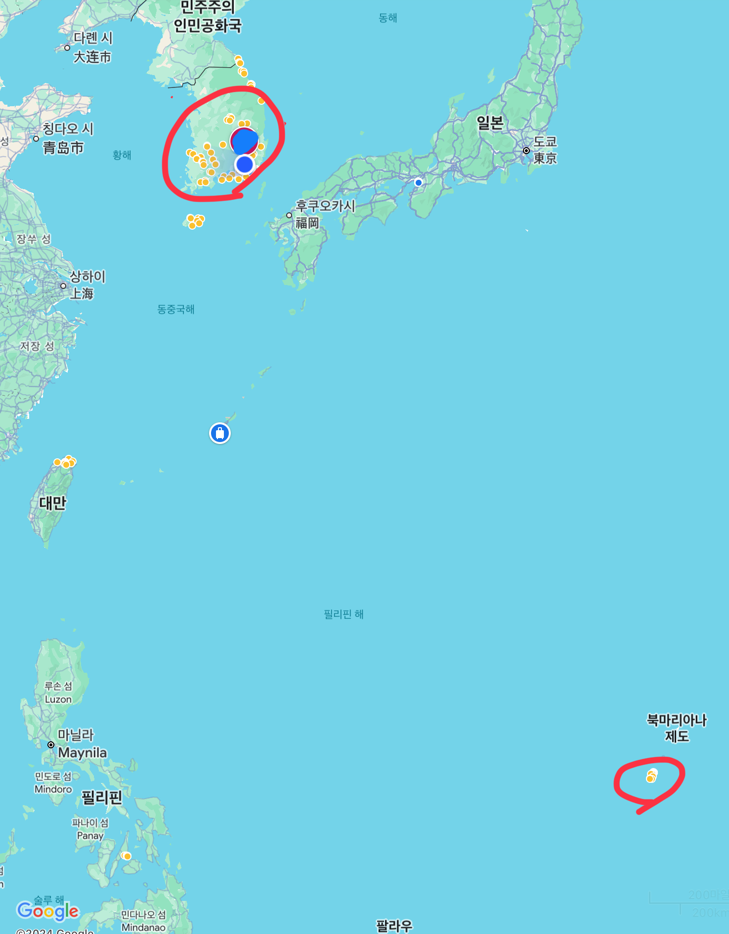 오른쪽 하단에 붉은색 원이 바로 괌입니다. 겁나 멀어 보이죠?